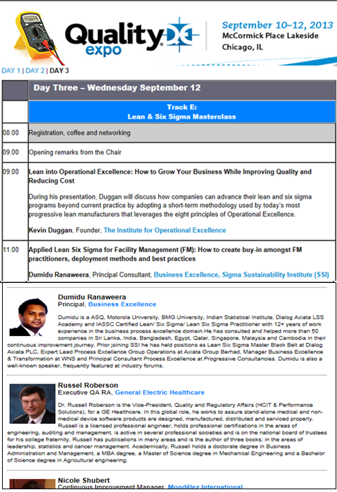 “Applied Lean Six Sigma for Facility Management (FM): How to create buy-in amongst FM practitioners, deployment methods and best practices” Master class session at Quality Expo 2013, organised by Canon UBM and ASQ, Chicago,IL - Sep,2013