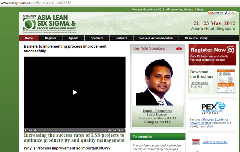 “Case study: Lean Six Sigma deployment at Dialog Axiata PLC”Key note session at the 12th Annual Lean Six Sigma Summit organised by IQPC Singapore (www.sixisigmaasia.com) – June, 2011