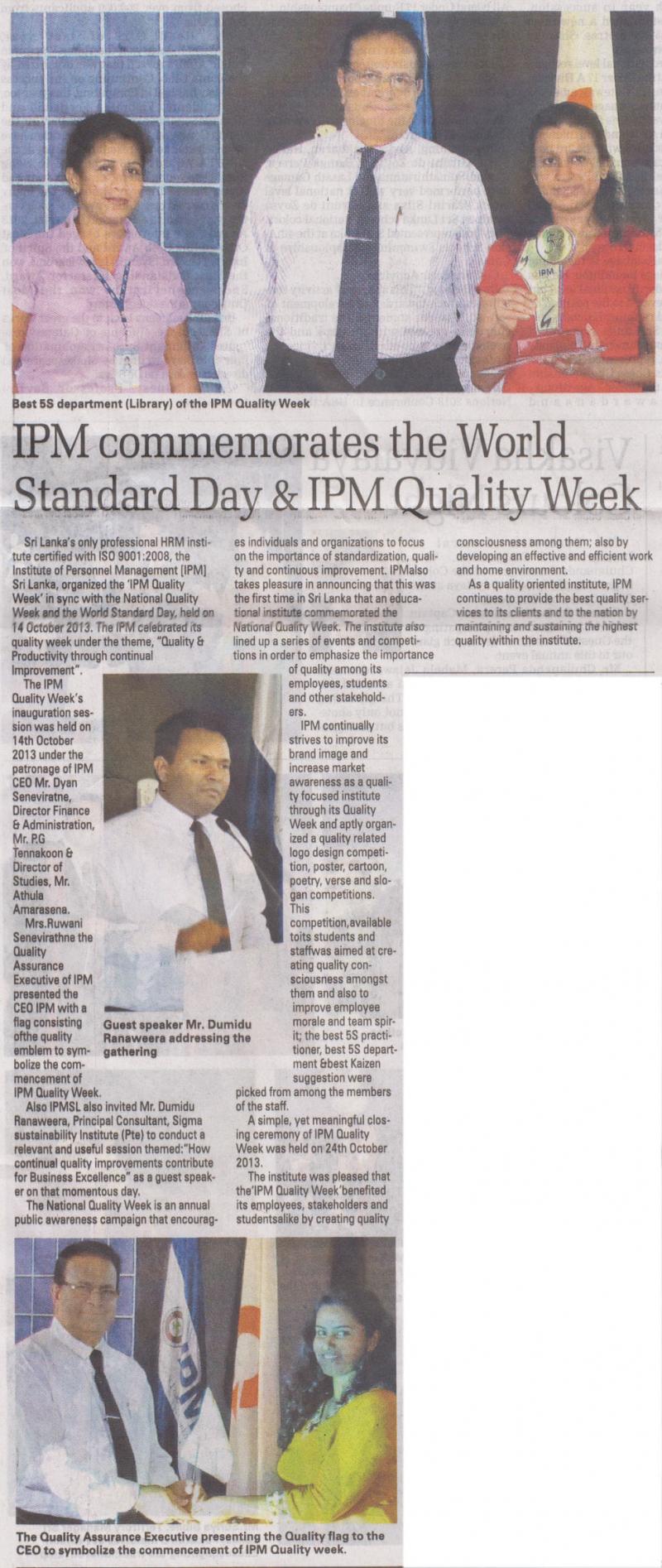 “Quality to Business Excellence” Chief Guest and Keynote address at the IPM Quality Week inauguration ceremony held for IPM staff members and students - organised by IPM, Colombo, Sri Lanka –Oct, 2013
