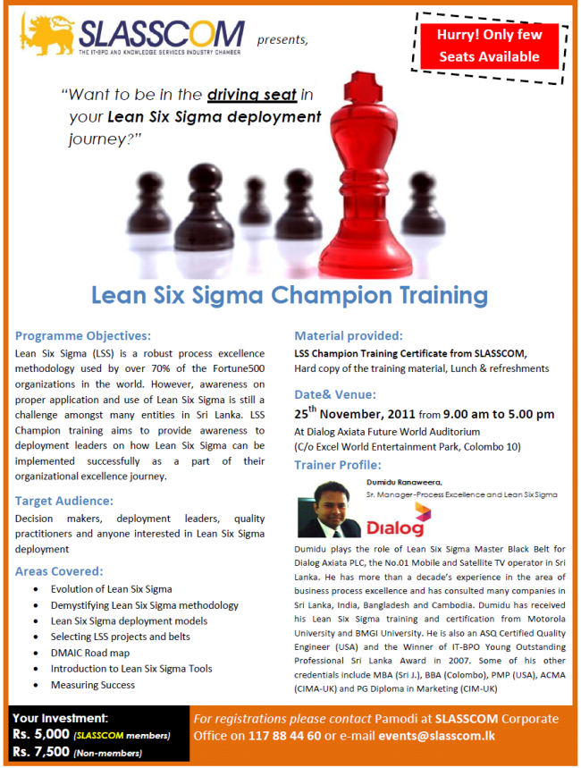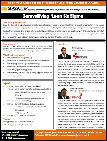“Demystifying Lean Six Sigma” a workshop for quality practitioners in IT-BPO organisations, organised by SLASSCOM, Colombo, Sri Lanka -Oct 2011